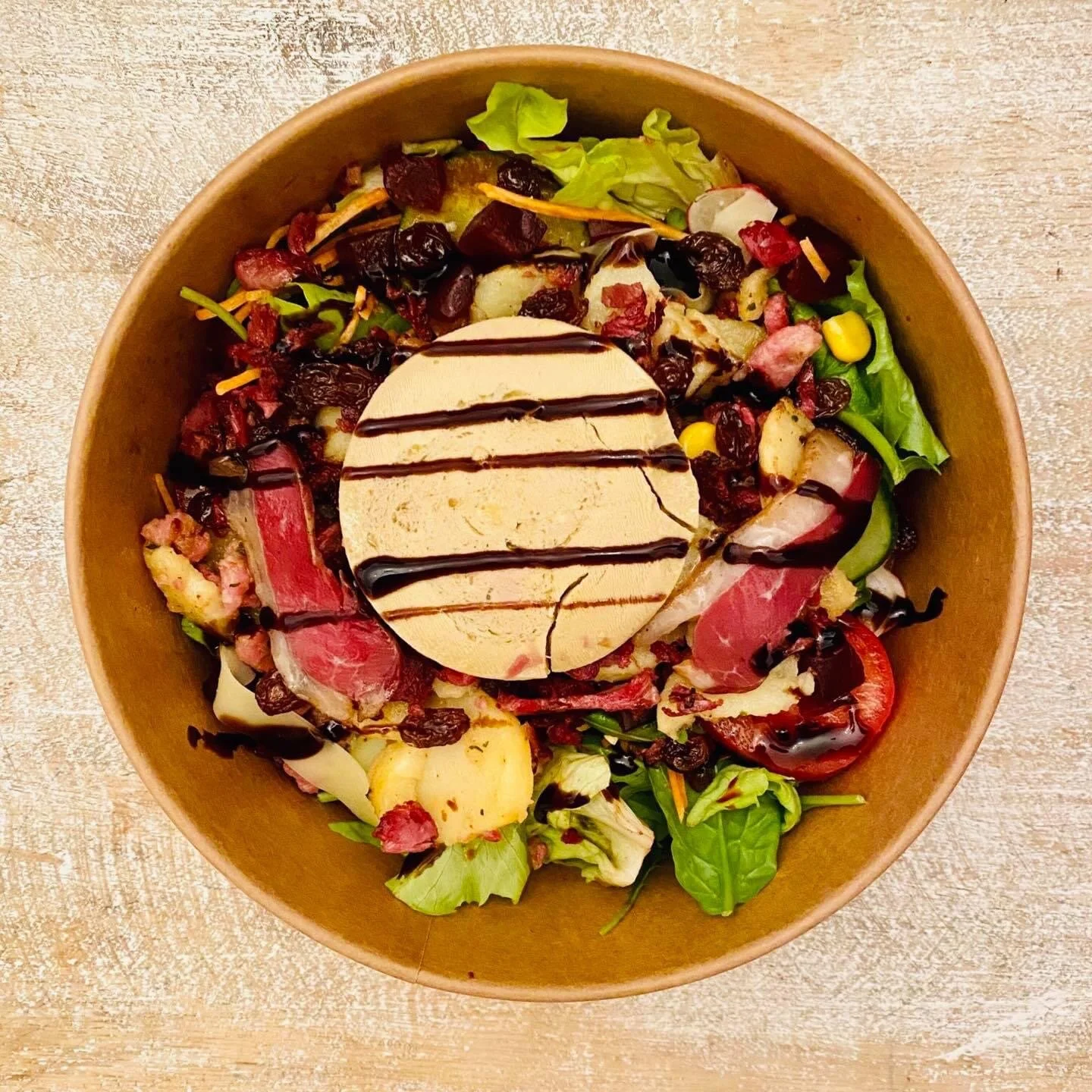LA GOURMETT’ISSIMA : Salade, crudités fraîches selon arrivage, vinaigrette, lardons, pomme de terre, raisin sec, gésier confit, magret de canard, foie gras, crème de balsamique